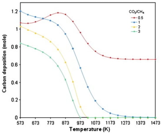The amount of produced carbon species (mol) during dry reforming of methane (DRM) reaction as a function of temperature and CO2/CH4 ratio at atmospheric pressure for n(CH4 + CO2) = 2 mol. Reprinted with permission from Ref. [39]. Copyright (2011) Elsevier.