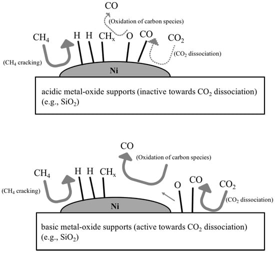 It has been generally believed that acidic supports (e.g., SiO2, Al2O3) facilitate the dissociation of methane leading to predominant methane cracking reaction over CO2 dissociation, which produce atomic oxygen and this, in turn, resulted in carbon formation on catalyst surface. In contrast, metal-oxide supports, such as MgO, La2O3 with high basicity promote dissociative adsorption of CO2, which can result in the suppression of carbon formation by producing higher number of oxygen atoms near the catalytic active metal surface [26,27,28,30,50]. The DRM reaction proceeds via three major step reactions (CH4 cracking, CO2 dissociation, and oxidation of carbon species on Ni surface) over Ni particles supported either by acidic metal-oxide (e.g., SiO2) or basic metal-oxides (e.g., MgO) are schematically described in Figure 3.