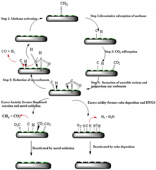 The DRM reaction over supported Ni catalyst mainly proceed via two steps: (1) decomposition of methane; and, (2) CO2 dissociation. It is generally agreed that dissociation of methane on Ni surface is the rate determining step of DRM reaction. Dissociated CH3 species are adsorbed on a top of Ni atom, whereas CH2 species prefer to be adsorbed between two adjacent Ni atoms. The dissociative adsorption of CH4 on Ni atoms is favored at step sites than that on terrace Ni atoms and this can explain higher catalytic activity of small Ni nanoparticles compared to bigger counterparts, which possess less amount of step Ni atoms per unit mass of Ni. Decomposition of a methane molecule leaves carbon atoms (atomic carbon, or CHx species) on Ni surface and these carbon atoms need to be oxidized into carbon monooxide that will be desorbed from Ni surface regenerating active Ni surface. The oxidation of the carbon atom on Ni surface is mainly proceeded by interaction with an atomic oxygen either on the surface of Ni or supports. Dissociate adsorption of CO2 is a major route for the generation of atomic oxygen on Ni surface during DRM and is generally considered as a fast process. When Ni particles are supported on inert metal-oxides, such as SiO2, the CO2 dissociation takes place on the surface of Ni particles. On the other hands, on the other active metal-oxide supports (e.g., MgO, La2O3, Ga2O3), chemisorption, and dissociation of CO2 can take place on the surface of supports or Ni-supports interfaces [29,52,53]. It has been suggested that higher basicity of metal-oxides supports can facilitate CO2 dissociation on the supports surface [26,54]. Some metal-oxides, such as CeO2 and ZrO2, can provide their lattice oxygen to oxidize carbon atoms on Ni surface into carbon monooxide [55,56,57]. The oxidation of carbon species from the Ni surface can also proceed via an interaction with hydroxyl groups on the surface, but this process has been suggested only significant at low temperature (<800 °C) [41,44].