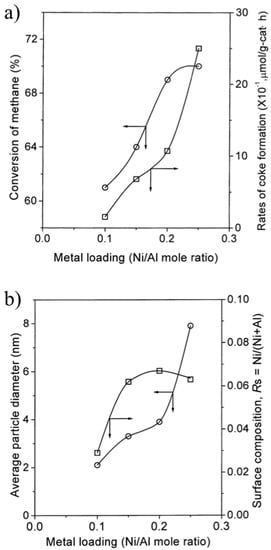 Kim et al. reported the relationship between the carbon formation and size of Ni particles by performing DRM reaction over alumina supported Ni particles that were prepared via a sol-gel method and a subsequent supercritical drying process [63]. The average diameter of Ni particles drastically increased with increasing metal loading over 0.2 in Ni/Al mole ratio, while only the marginal change was found in the surface composition (Figure 5). This large increase of particle size with increasing metal loading attributed to the re-dispersion or aggregation of metal Ni particles during the thermal treatment. It was strongly correlated to the higher amount of filamentous carbon that formed on the surface Ni particles during DRM, as confirmed by TEM analysis performed after the DRM reaction at 773 °C for 30 h [63].