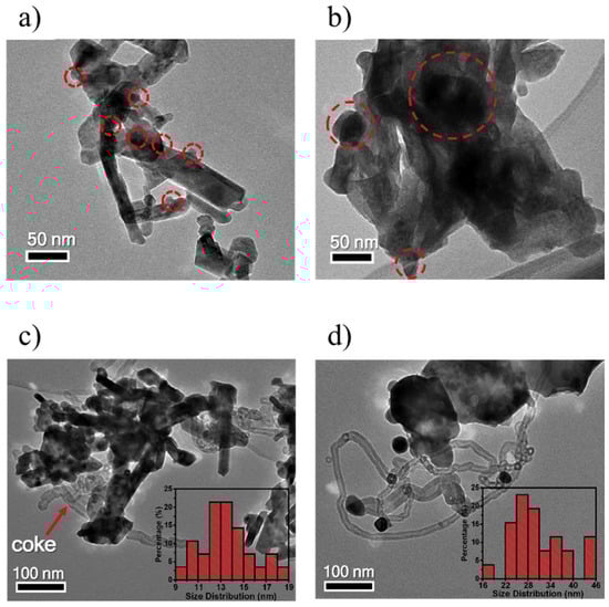 TEM image of (a) Ni nanoparticles synthesized on La2O3 nanorod (denoted as 5Ni/La2O3-LOC in Ref. [60]) and (b) on La2O3 supports via a wet impregnation method (denoted as 5Ni/La2O3-C in Ref. [60]) before DRM reaction. TEM image of (c) Ni nanoparticles on La2O3 nanorod (denoted as 5Ni/La2O3-LOC in Ref. (denoted as 5Ni/La2O3-C in Ref. [60]) Insets of (c,d) present the size distribution of Ni particles on each support. Reprinted with permission from Ref. [60]. Copyright (2017) Elsevier.