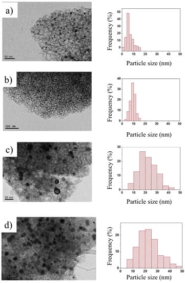 Recently, some research groups presented the modified impregnation method using various chelating ligands to immobilize Ni nanoparticles in mesoporous silica. Kang et al. used a polyethyleneimine (PEI) as a chelating ligand of Ni precursors during impregnation processes [82]. Ni-PET complexes were well distributed inside the pores and strongly bound the SBA-15 silica surface through the strong interaction between NH2 terminal groups of PEI and surface silanol groups of silica. Moreover, steric hindrance of PEI ligands prevented the aggregation of Ni-PEI complexes during the impregnation processes. It resulted in better dispersion of small Ni nanoparticles with narrower size distributions compared to the respective one prepared by classical impregnation method without using chelating ligands (Figure 7) [82]. The prepared catalysts showed stable catalytic activity towards DRM at 750 °C for 40 h and the size of Ni particles inside pores of SBA-15 silica was confined by pore structures of parent supports [82].