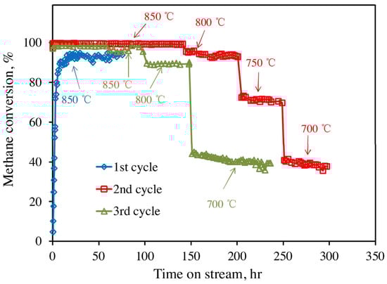 Although utilization of ligand during the impregnation method can improve dispersion of Ni nanoparticles inside the pore structure of supports, it has been reported that the formation of some Ni particles outside of pores during wet-chemical processes is still not avoidable, which are subject to aggregation during the DRM reaction [82,83]. Alternatively, small Ni nanoparticles can be embedded inside pores of porous supports using dry-methods. It can be more advantageous for preparation of small metal nanoparticles on porous supports since incorporation of gas phase precursor into the pore structure is much easier than aqueous precursors. Especially, atomic layer deposition (ALD) has been considered as a suitable technique for the preparation of small metal nanoparticles inside the pore structures of various supports. ALD is a self-limiting and self-terminating deposition technique where two gas phase precursors (metal precursor and oxidizing/reducing precursor) are injected onto the surface of substrates separately in a sequential manner. Gould et al. synthesized highly dispersed small Ni nanoparticles (particle size of ~4 nm) on alumina supports by ALD processes. The ALD-prepared Ni catalysts exhibited higher catalytic activity and carbon-formation resistance when compared to one prepared via incipient wetness (IW) process, which is attributed to smaller size of Ni particles with better dispersion of ALD-prepared sample than IW-prepared one [84]. Shang et al. prepared small Ni nanoparticles (mean diameter: ~3.6 nm) supported either by a porous γ-Al2O3 support using ALD process. The prepared catalysts showed high catalytic reactivity and exceptionally high stability towards DRM reaction performed in the range of 700 and 850 °C for 300 h (Figure 8) [85]. They also suggested that stronger bonding force between Ni nanoparticles and alumina supports was established for ALD-prepared sample than IW-prepared based on the larger size and lower catalytic performance of Ni nanoparticles that were prepared by IW method [86].