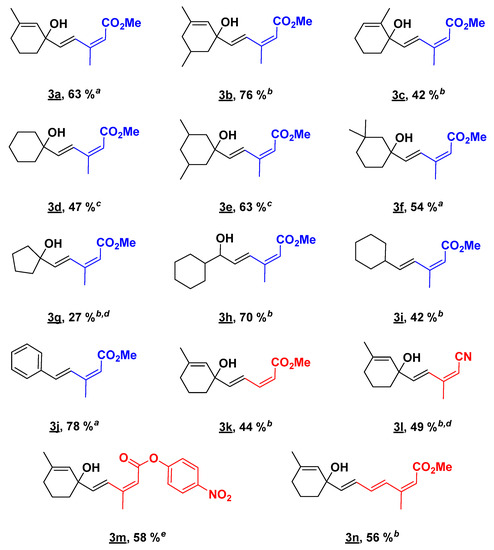 Finally, different vinylic iodides were submitted to our solvent-free Mizoroki-Heck conditions. (2Z)-3-iodobut-2-enenitrile 2a, Methyl (2Z)-3-iodoacrylate 2b, and 4-nitrophenyl(2Z)-3-iodobut-2-enoate 2c were successfully introduced on 1-ethenyl-3-methylcyclohex-2-en-1-ol 1 leading to expected compounds (3k–3m). Compound 3k appeared to be more sensitive to degradation than 3a, but the (E,Z) configuration remained unchanged. The reaction conditions were then extended to the formation of (E,E,Z) tertiary trienol 3n, using Methyl (2Z,4E)-5-iodo-3-methylpenta-2,4-dienoate (2e), which was isolated in 56% yield.