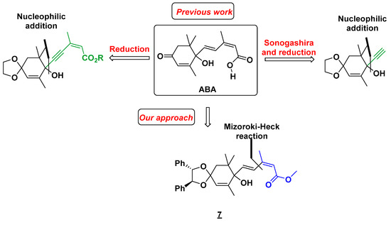 Having a method to obtain the diene scaffold in hand, we focused on the synthesis of abscisic acid (ABA). Several syntheses have already been reported in the literature [59,60,61]. Most of them are based on the introduction of the carbon skeleton of the side chain via the corresponding alkyne in one step [62,63,64,65] or with trimethylsilylacetylene [66,67], which is then functionalized by a Sonogashira reaction (Scheme 2). Our strategy requires a reduction step to obtain the final (E,Z) diene fragment. Our approach is based on the introduction of the side chain with our solvent-free Mizoroki-Heck reaction between methyl (2Z)-3-iodobut-2-enoate 2 and 7. Our key cross-coupling precursor was straightforwardly obtained from the commercially available 2,6,6-trimethylcyclohex-2-ene-1,4-dione 5.