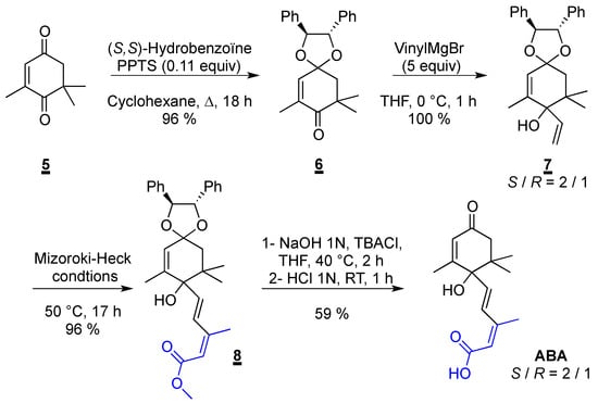 - Hanson, J.R.; Uyanik, C. An efficient synthesis of the plant hormone abscisic acid. J. Chem. Res. 2003, 7, 426–427. [Google Scholar] [CrossRef]