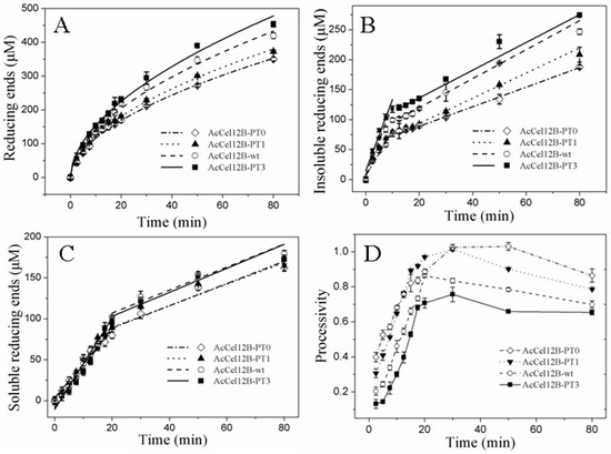 As we previously indicated, the hydrolysis of insoluble substrates by wild-type AcCel12B is performed in multiple reaction steps that can be divided into an initial rapid phase and a later slow phase [21]. The insoluble substrates RAC and Avicel were used to determine the role of the PT/S-box in catalysis. However, the activity of wild-type and mutant AcCel12B on Avicel were not high enough to determine the initial rapid phase. Thus, RAC was the sole substrate used in this section. Enzyme catalysis was examined by incubating wild-type and mutant AcCel12B with RAC for various time durations and then measuring the amounts of reducing ends in the supernatant and pellet, respectively (Figure 3). The hydrolytic generation of reducing ends from the substrate by cellulases was previously reported to be best fitted by a power function described by Kostylev et al. [31], as mentioned below.