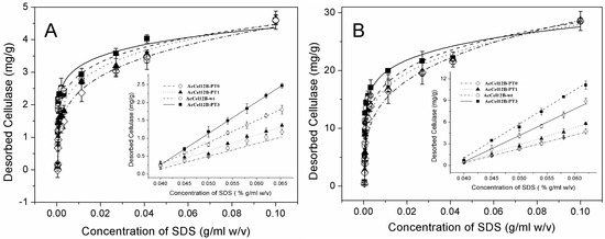 The solid-bonded protein was rapidly desorbed from Avicel and RAC in the low-concentration range of SDS, followed by gradual desorption at high concentrations of SDS (Figure 5). The amount of desorbing cellulases correlated linearly with low SDS concentrations (Figure 5A,B insertion). Therefore, the slopes of linear fit of desorption were obtained at low SDS concentration (Table 4). At the same SDS concentration, the amount of desorbed protein increased with the number of PT/S-box units. These results suggested that the wild-type and mutant AcCel12B enzymes containing more PT/S-box units were easily desorbed from cellulose in low SDS concentration ranges. The desorption of wild-type and mutant AcCel12B was also significantly different at high SDS concentrations (Figure 5). The parameters Kf and n of wild-type and mutant AcCel12B were calculated (Table 5). The Kf values of cellulases desorbing from Avicel reduced gradually in a step of approximately 0.6 (mg/g)/(g/mL)n per PT/S-box unit added. The Kf values of cellulases desorbing from RAC reduced unevenly with the number PT/S-box units. The decrease of AcCel12B-PT0 to AcCel12B-PT1 and AcCel12B-wt to AcCel12B-PT3 was approximately 7.0 (mg/g)/(g/mL)n. The decrease of AcCel12B-PT1 to AcCel12B-wt was approximately 1.0 (mg/g)/(g/mL)n. The date of Kf illustrated the amount of cellulases that adsorbed on the cellulose. Studies show that Kf was related to the molecular size and adsorbate-solvent interactions [43]. SDS-PAGE showed that the molecular size of cellulases increased with the number of PT/S-box units of the recombinants (Figure 2). Previously, studies using SAXS demonstrated that linker deletion altered protein topology [11,30]. Hence, the differences in the size of the protein molecules may explain the diverse Kf values of wild-type and mutant AcCel12B.