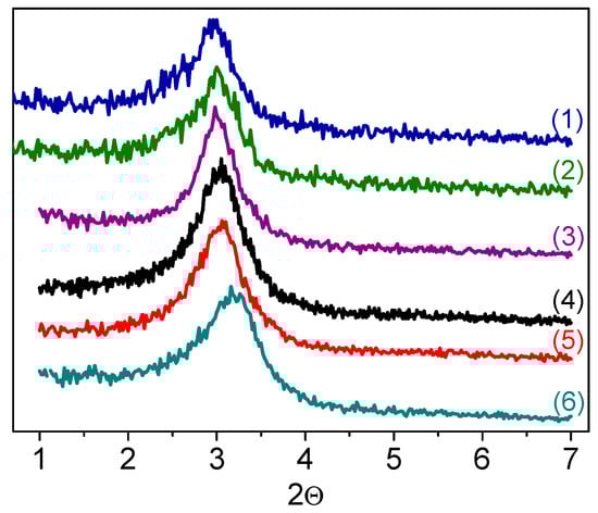 XRD patterns of calcined W-MMM-E catalysts: (1) C-1; (2) B-1.4; (3) A-1; (4) A-2; (5) A-2 after treatment with aqueous H2O2 in CH3CN (25 °C, 1 h) and (6) A-2 after treatment with boiled water for 6 h.