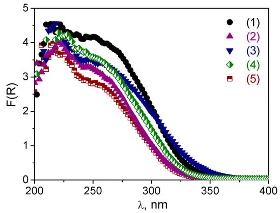 DR UV-vis spectra of calcined W-MMM-E catalysts: (1) A-2; (2) A-1; (3) B-1.4; (4) B-1; and (5) C-1.