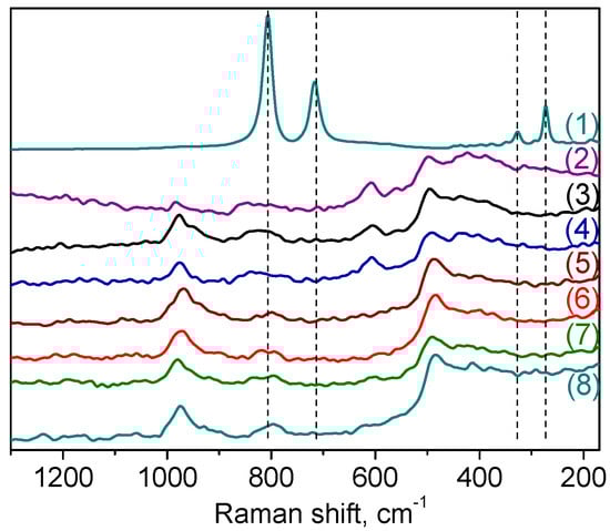 Raman spectra of (1) WO3; (2) calcined SiO2-EISA matrix, and calcined W-MMM-E catalysts: (3) A–2; (4) A–1; (5) A-2 after treatment with H2O2; (6) A-1 after treatment with H2O2; (7) A–2 after catalytic oxidation of cyclooctene; and (8) A–1 after catalytic oxidation of cyclooctene. Reaction conditions were as in Table 2.