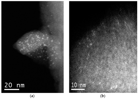 STEM-HAADF (high angle annular dark field in scanning-TEM mode) images of the W-MMM-E (sample A-1) exhibit nanoscale inclusions of tungsten associates, unevenly distributed over the silica surface. Two representative images are given in Figure 4. Figure 4a shows a piece of the catalyst with W-containing particles of 1–2 nm dispersed on the surface. However, such large particles are much less common in other parts of the catalyst. Some ordering of the mesopores with a periodicity of ~2 nm can be noticed in Figure 4b. One can also distinguish here bright clusters with a size less than 1 nm and spots of particles with an elongated shape, which correspond to polytungstate species. These spots have a lower contrast, most likely because they are located inside the mesopores and not on the external surface of the catalyst particles.