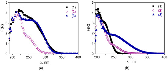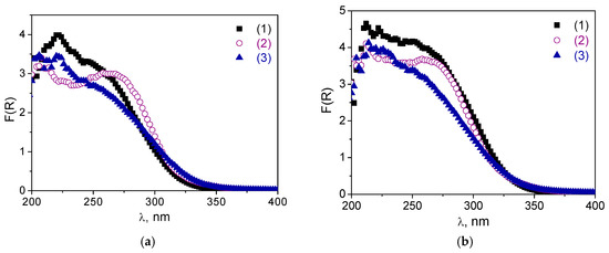 DR UV-vis spectra of (a) A-1 and (b) A-2: (1) initial calcined; (2) and (3) after catalytic reaction of CyOct oxidation—uncalcined and calcined, respectively. Reaction conditions: CyOct 0.1 mmol, H2O2 0.1 mmol, catalyst 0.001 mmol W, CH3CN 1 mL, 50 °C.
