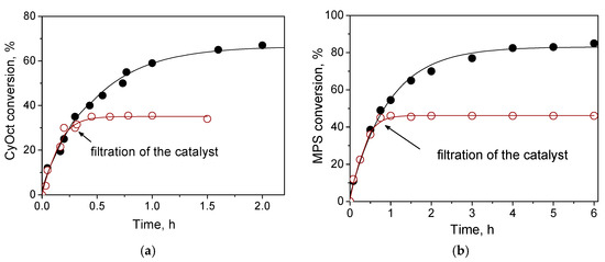 Hot catalyst filtration test for (a) CyOct oxidation with 30% H2O2 over C-1 and (b) MPS oxidation with 30% H2O2 over B-1. Reaction conditions: (a) CyOct 0.1 mmol, H2O2 0.1 mmol, catalyst 0.001 mmol W, CH3CN 1 mL, 50 °C; (b) MPS 0.1 mmol, H2O2 0.1 mmol, W-EISA 0.001 mmol W, CH3CN 1 mL, 25 °C. (-●-) CyOct or MPS conversion in the presence of catalyst and (-○-) experiment with hot catalyst filtration.