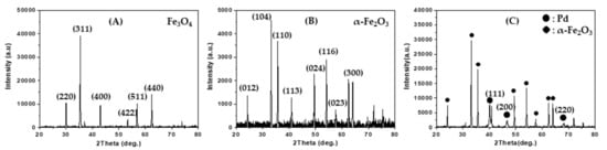 XRD patterns of (A) as-prepared Fe3O4 powder, (B) calcined Fe3O4 (α-Fe2O3 (sp200)), and (C) Pd/α-Fe2O3 (sp200). Fe3O4 (JCPDS No. 00-039-1346); α-Fe2O3 (JCPDS No. 01-089-0958); Pd (JCPDS No. 7440-05-3).