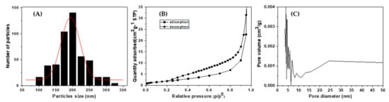 (A) Particle size distribution, (B) N2 adsorption–desorption isotherm, and (C) pore size distribution of α-Fe2O3 (sp200) powder.