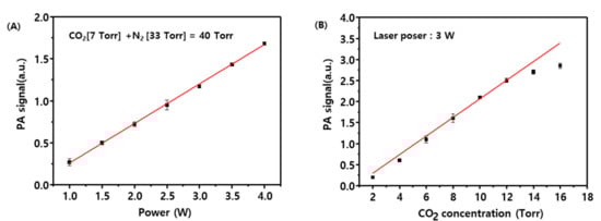 Variations of CO2 photoacoustic (PA) signals with (A) laser input power and (B) CO2 concentration.