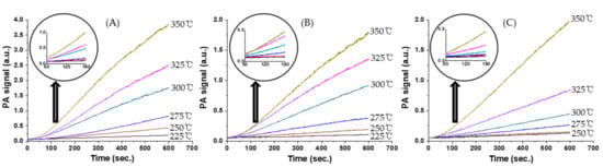 In any kinetics study, monitoring the time-dependent variation of the concentrations of reactants and/or products is considered to be crucial. It has been known that photoacoustic spectroscopy (PAS) is suitable to in situ monitor a reaction processes in its initial stage []. Since signals obtained from PAS rely on the concentration of a target species and PAS detects extremely low level molecular gases with high selectivity and large signal intensity, temporal variations in concentration can be readily measured even in a short period of reaction times where rates are high. Thus, low molecular level photoacoustic results are believed to provide more accurate kinetic information for catalytic reactions, especially when the reaction occurs on a relatively clean surface of catalysis.