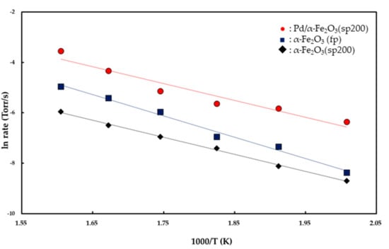 As shown in Figure 6, the apparent activation energies for CO oxidation were determined as 16.8 (±0.3) kcal/mol for the Fe2O3 (fp) catalyst and 13.4 (±0.1) kcal/mol for the Fe2O3 (sp200) catalyst in the temperature range of 225–350 °C. It is expected from the magnitude of the apparent activation energies that the reactants are chemisorbed on the catalyst surface. Specifically, Fe2O3 is oxygen deficient and oxygen vacancies are considered as the predominant defect for the oxide. Oxygen vacancies are readily generated in the oxide when Fe2O3 is heated at a low pressure [,]. Typically, oxygen vacancies in metal oxides act as adsorption sites for O2 (g) because they serve as electron donors. When O2 (g) is adsorbed (ads) on the oxygen vacancy, it is dissociated into two oxygen atoms as follows: