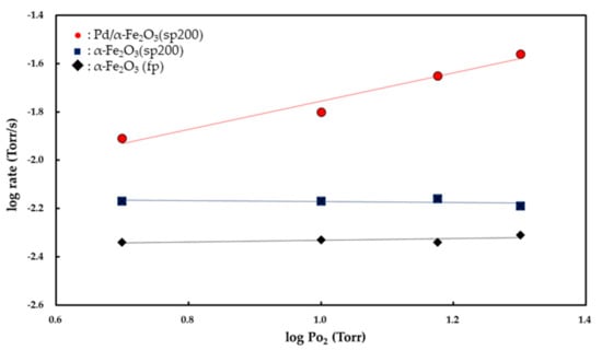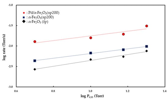 Figure 7 and Figure 8 show the Pco and Po2 dependencies of the rate of CO2 formation, respectively. Partial orders with respect to Pco and Po2 were determined from the slopes of the linear curves. Both the α-Fe2O3 (fp) and α-Fe2O3 (sp200) catalysts exhibited zero-order kinetics for Po2 while the Pd/α-Fe2O3 (sp200) catalyst showed 0.48 (±0.03)-order with respect to Po2. The partial order with respect to PCO was determined to be 0.85 (±0.03)-order for the α-Fe2O3 (fp) catalyst, 0.58 (±0.1)-order for the α-Fe2O3 (sp200) catalyst, and 0.54 (±0.06)-order for the Pd/α-Fe2O3 (sp200) catalyst.