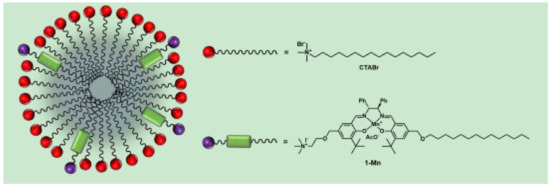 The micellar nanoreactor was assembled using 1-Mn and cetyltrimethylammonium bromide (CTABr) as co-surfactant in a different molar ratio (see Table 1). We selected a cationic surfactant to obtain a micellar surface fully covered by the same positive charges. In addition, catalyst was designed in order to confine the catalytic metal center inside the hydrophobic region of the nanoreactor (see Figure 1), in contrast with our previous works where it was located on the Stern layer [17,18]. We think the catalytic site sequestered in the interior of micelles should lead to higher reaction rates, due to a proximity effect with the alkene inside the core of a micelle.