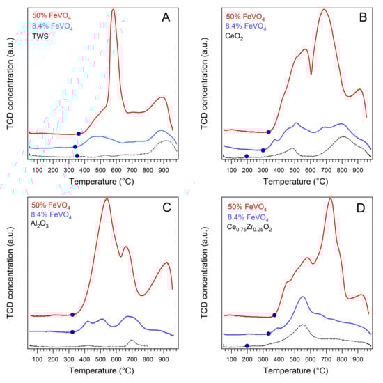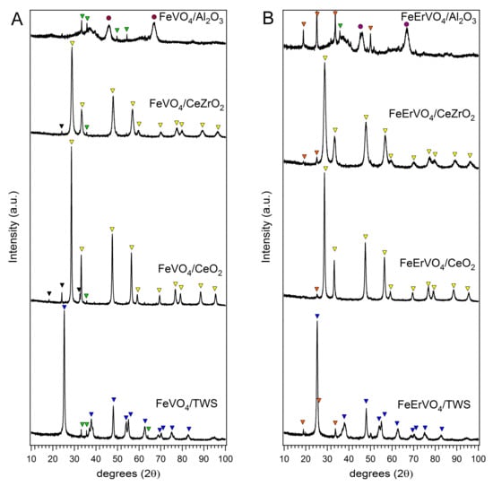 - Gillot, S.; Tricot, G.; Vezin, H.; Dacquin, J.-P.; Dujardin, C.; Granger, P. Development of stable and efficient CeVO4 systems for the selective reduction of NOx by ammonia: Structure-activity relationship. Appl. Catal. B Environ. 2017, 218, 338–348. [Google Scholar] [CrossRef]
