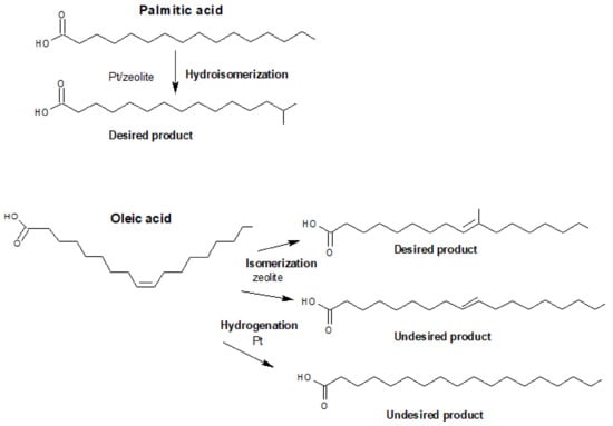 Desired and undesired products from the isomerization/hydroisomerization of oleic acid and the hydroisomerization of palmitic acid (modified from Reference [16]).