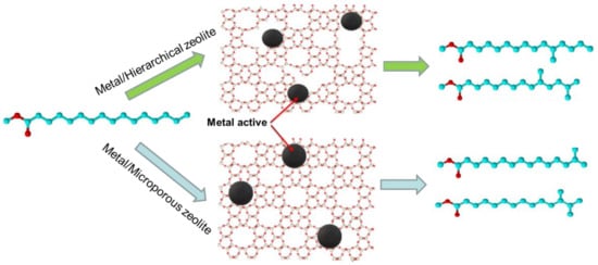 The acidity of the zeolite is a crucial factor in determining the overall catalytic performance in the upgrading of vegetable oils to produce low-pour-point insulating and lubricating oils. The degree of acidity and the acid site types (Brønsted or Lewis) determine the degree to which the cracking or isomerization reaction is favored. Mériaudeau et al. [40] studied the performance of 1%Pt/SAPO-41, 1%Pt/SAPO-31, and 1%Pt/SAPO-11 catalysts in n-octane hydroisomerization through a fixed-bed continuous flow reactor at 200–400 °C under atmospheric pressure. The catalytic activity decreased in increasing order of the amount and strength of acid sites: SAPO-41 > SAPO-11 > SAPO-31. However, the reaction rate was most strongly restricted by diffusion in the microporous channels of the SAPO-type zeolite. The low activity of the catalyst based on SAPO-31 zeolite resulted from the combined effect of its diffusion limitations and low acidity. Verma et al. [39] synthesized hierarchical mesoporous crystalline HZSM-5 zeolite catalysts in high-surface-area and low-surface-area types for the hydroconversion of algae and Jatropha seed oil to jet fuel. According to 27Al MAS NMR analysis, the concentration of extra-framework Al present in the high-surface-area zeolite sample was higher than that in its low-surface-area counterpart, representing an increased number of Lewis acid sites in the former [41]. The former catalyst type also had more strong acid sites, favoring cracking and thus decreasing its isomerization selectivity. SAPO-11 and ZSM-22 have been used widely in paraffin long-chain hydroisomerization catalysts because of their moderate acidity and straight channels of 10-membered rings. The drawback of this zeolite type is its lower acid site density at the pore mouths where the main isomerization occurs, according to the pore mouth and key-lock mechanism [42,43].