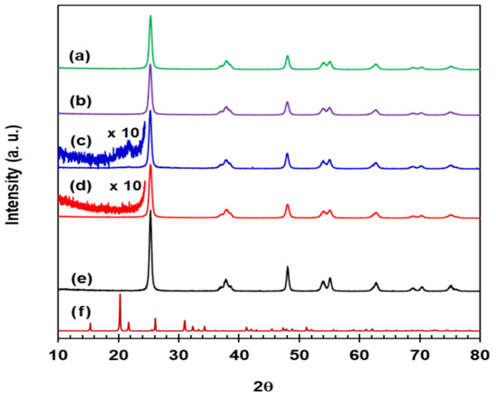 XRD patterns for: (a) VWT; (b) 2.73% Fe2O3/VWT; (c) c-VWT; (d) 2.73% Fe2O3/c-VWT; (e) pure anatase TiO2; and (f) α-phase orthorhombic V2O5.