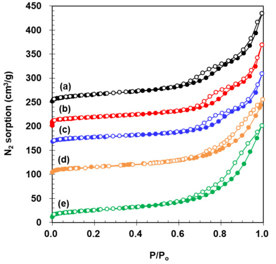 N2 sorption isotherms on: (a) WT; (b) VWT; (c) 2.73% Fe2O3/VWT; (d) c-VWT; and (e) 2.73% Fe2O3/c-VWT.