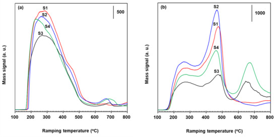 In the TPD of NH3 adsorbed on VWT, 2.73% Fe2O3/VWT, c-VWT, and 2.73% Fe2O3/c-VWT, mass spectra for the releasing NH3 and gaseous products such as H2O, N2O, NO, and N2 are provided in Figure 5 and Figure 6. Predominant desorption of the adsorbed NH3 occurred at temperatures ranging from 225 to 275 °C with bumps at 370–425 °C and high-temperature peaks at 650–690 °C, depending on the catalyst, as shown in spectra S1 to S4 in Figure 5a. Both a downward-shift of a maximum desorption temperature by 20–35 °C and an appreciable increase of the 650–690 °C NH3 occurred on the Fe2O3-promoted samples (Figure 5a(S2,S4)). This implies that although the Fe2O3 species weakened the acid strength of sites for NH3 desorbing at relatively low temperature region, they could significantly increase very stable NH3 species. This agrees well with the discussion above. Figure 5b shown for H2O generation is indicative of the oxidation of the adsorbed NH3 to the N-containing products. The H2O gave peaks with maxima around 250–260, 450–470, and 645–660 °C, depending on the sample (Figure 5b(S1–S4)). A relatively much higher H2O production at the 645–660 °C region was detected for c-VWT and 2.73% Fe2O3/c-VWT (Figure 5b(S3,S4)), proposing that these catalysts can, to a much greater extent, oxidize the adsorbed NH3 species into the N-containing gases, as shown below.