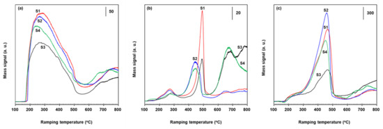 Mass spectra for N2 evolved in NH3 TPD runs with the unpromoted and promoted catalysts are shown in Figure 6c. Each catalyst had a predominant peak at 450–465 °C with a shoulder at 280–350 °C and a broad peak at temperatures >600 °C, depending on the sample, as seen in profiles S1–S4. As for NO and N2O in Figure 6a,b, all those N2 peaks would be associated with ammonium ions and NHx on Bronsted and Lewis acid centers [43,44,45]. The NHx species are oxidized to N2 via NO-assistant route, as discussed [11,39,48]. The presence of Fe2O3 in VWT and c-VWT caused not only a shift of the major N2 peak to lower temperatures, by 5–15 °C, but also a significant increase in their intensity, and such changes were greater for the commercial-based catalysts (Figure 6c(S3,S4)). These are in good accordance with the observed trend in the water production of H2O as an indicator of N-associated side reactions (Figure 5b). It is thought that the promotion by amorphous iron oxide particles can decrease the activation energy for the oxidation of the adsorbed NH3 species into N2 and significantly enhance this reaction.