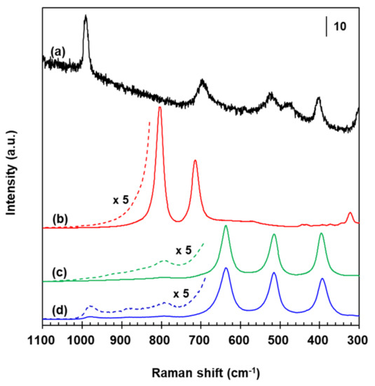 Figure 7 shows Raman spectra for reference materials and WT whose original signals have been reduced by 1/10–1/1000 for an easier comparison, but all bands have been kept unchanged even after such a data processing. α-phase V2O5 polycrystallites yielded a sharp peak at 990 cm−1 with subsequent signals near 400, 470, 515, and 700 cm−1, as seen in Figure 7a. Crystalline WO3 had characteristic sharp bands around 800 and 715 cm−1 (Figure 7b), and no Raman signals at frequencies >800 cm−1 even in a magnified spectrum existed as indicated by the dashed line. The measured spectra for the V2O5 and monoclinic γ-WO3 (P21/n) are in agreement with earlier studies [49,50]. Bands due to highly-dispersed amorphous WOx in a sample of WT that has been employed for preparing VWT and 2.73% Fe2O3/VWT catalysts can be differentiated by comparing with those existing in a bare anatase TiO2 (Figure 7c,d). This support had Raman signals at 397, 515, and 638 cm−1 (Figure 7c) with a predominant band at 145 cm−1 and a weak one at 197 cm−1 (not shown here). The 397, 515 and 145, and 197 and 638 cm−1 bands correspond to the respective B1g, A1g + B1g and Eg phonon vibrations of anatase-type TiO2 [49,51,52,53]. A weak signal at 793 cm−1 (see the magnified spectrum in Figure 7c) is due to the first overtone of the 395 cm−1 [49,52,53]. Besides these peaks, bands at 882 and 980 cm−1 existed in the WT sample, as provided in the magnified spectrum in Figure 7d. The 980 cm−1 peak is assigned to two-dimensional polytungstate species with distorted octahedrally-coordinated environments that have been reported for calcined WO3/TiO2 samples not exceeding a monolayer coverage [53,54]. The 882 cm−1 is associated with asymmetric W-O-W vibrations in polymeric surface WOx species [53]. It is represented that the WT sample has two different surface WOx species. The absence of the 800 and 715 cm−1 bands reveals no crystalline WO3 particles, indicating a very good dispersion of the tungsten oxide on the titania.