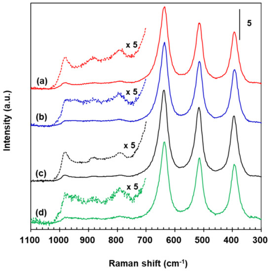 Raman spectra for VWT, 2.73% Fe2O3/VWT, c-VWT, and 2.73% Fe2O3/c-VWT are provided in Figure 8. All the catalysts had bands near 394, 515, 636, and 790 cm−1, that are due to the TiO2 support (Figure 7c), and they all also produced peaks at 880 and 981 cm−1 (Figure 7a–d). Any of the catalysts indicated no band near 1020–1030 cm−1 regarding isolated surface VOx species [35,55]. The 981 and 880 cm−1 peaks had appeared even in the WT-only sample (Figure 7d). Regardless, these two bands may not be originated from the W=O and W-O-W structures in the surface tungsten oxide species. Symmetric V=O and W=O stretching vibrations occur at 950–990 cm−1, making it difficult to clearly distinguish between both species, but the V=O species have an interaction cross section that is almost four times greater than that of the W=O groups [53,55,56,57]; thus, a Raman signal by the V=O structures in surface vanadium oxide species would give much stronger intensity at the frequency region. Furthermore, it has been reported not only for no appreciable mutual effect on the surface structures of VOx and WOx species in V2O5-WO5/TiO2 systems with low total VOx and WOx coverages but also for Raman bands at 940–987 cm−1, due to two-dimensional VOx species in 1–4.5% V2O5/TiO2 below a monolayer coverage, whose positions are usually higher, by 10–30 cm−1, than that of surface WOx species in 1–7% WO3/TiO2 [55,58]. Consequently, the 880 and 981 cm−1 bands correspond to the respective bridging V-O-V and terminal V=O structures in distorted octahedrally coordinated VO6 species, even in the TiO2-supported binary and ternary component systems employed here, and indicate the presence of polymerized mono-oxo vanadate species [49,53,55,56,58].