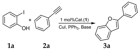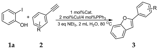Jiang P, Guo M, Fu L, Wen Y, Shen X, Zhou L. [(PhCH2O)2P(CH3)2CHNCH(CH3)2]2PdCl2/CuI as Cocatalyst for Coupling-Cyclization of 2-Iodophenol with Terminal Alkynes in Water. Catalysts. 2018; 8(4):136. https://doi.org/10.3390/catal8040136
