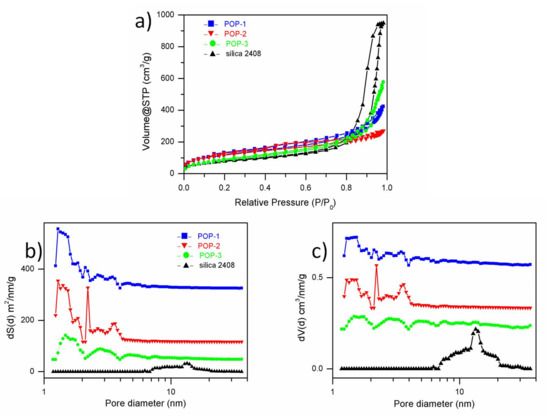 (a) N2 isotherms. Non-local density functional theory (NLDFT) pore size distribution curves of (b) dS vs. d and (c) dV vs. d of POPs and silica 2408.