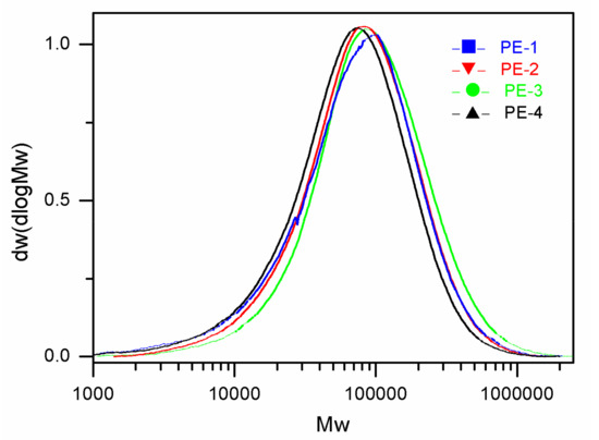 Curves of the molecular weight distribution of ethylene/1-hexene copolymers. (1) PE-1 obtained from BCZ/MAO@POP-1metallocene catalyst; (2) PE-2 obtained using BCZ/MAO@POP-2metallocene catalyst; (3) PE-3 obtained from BCZ/MAO@POP-6 metallocenecatalyst; (4) PE-4 obtained from BCZ/MAO@2408 silicametallocene catalyst.