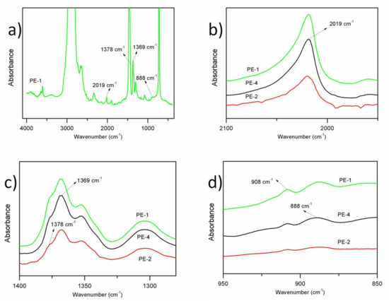 IR analysis results. (a) IR spectrum of PE-1; (b) IR spectrum at 2019 cm−1; (c) IR spectrum of methyl groups at 1378 cm−1 and methylene groups at 1369 cm−1; (d) IR spectrum of RCH=CH2 groups at 908 cm−1 and R1R2C=CH2 groups at 888 cm−1.