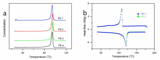 According to this Equation (1), the values of ΔHm of ethylene/1-hexene copolymers could be estimated for their crystallinity. From Table 2, we can see the ΔHm of PE-4 had the lowest value of 120.6 J/g. Therefore, the lowest crystallinity of PE-4 among these samples could be estimated, which is consistent with nearly the highest branching degree from the IR results. Although a discrepancy between the values of ΔHm from PE-1/PE-2/PE-3 and their branching degree was observed, the discrepancy combined with a relatively wide range of Tc (peak) value of these PE samples might be partly explained by the different distribution and content of SCB in the their chains, which was caused by tuning the diffusion of ethylene and 1-hexene in different pore sizes. Furthermore, a minor peak with ΔHc of about 4.3 J/g on the crystalline curves of PE-1 or PE-4 around 73 °C was observed as seen from Figure 5b, and this small crystalline peak is in agreement with the TREF signals of the secondary peak of these PE samples—both of which are caused by the crystalline molecules with relatively high SCB content.