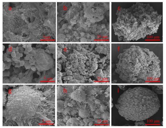 Scanning electron micrographs of PE copolymers particles. (a–c) PE-1 from POP-1-supported metallocene catalyst; (d–f) PE-2 from POP-2-supported metallocene catalyst; (g–i) PE-4 from 2408 silica-supported metallocene catalyst.