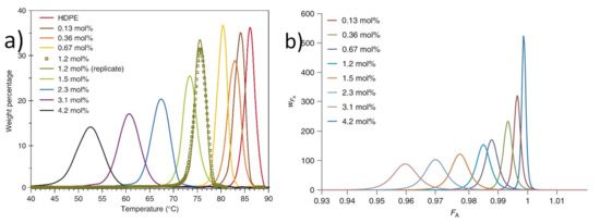 (a) CRYSTAF profiles of ethylene/1-hexene copolymers prepared from a single-site catalyst; (b) chemical composition distributions predicted with Stockmayer distribution [44]. CRYSTAF: is a fully automated instrument intended for the fast measurement of the Chemical Composition Distribution (CCD) in Polyolefins, and performs the Crystallization Analysis Fractionation technique to separate the polymer by its comonomer content. HDPE: high density polyethylene.