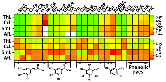 Laccase activities toward different phenolic substrates. The following abbreviations are used: SinA = synapic acid, FA = ferulic acid, CafA = caffeic acid, p-CA = p-coumaric acid, o-CA = o-coumaric acid, m-CA = m-coumaric acid, GA = gallic acid, SyrA = syringic acid, DHBA = 3,4-dihydroxybenzoic acid, VA = vanillic acid, Vn = vanillin, Cat = catechol, Gua = guaiacol, HQ = hydroquinone, DMP = 2,6-dimethoxyphenol, Orc = orcinol, Xyl = 2,5-xylidine, AMBA = 2-amino-4-methoxybenzoic acid, Eug = eugenol, SGL = syringaldazine, BrG = bromocresol green, PhR = phenol red, CnR = congo red, and InC = indigo carmine, ThL = Trametes hirsuta laccase, CcL = Coriolopsis caperata laccase, AfL = Antrodiella faginea laccase, and SmL = Steccherinum murashkinskyi laccase. The white cells on the upper panel represent points where no activity was detected. The Z-scores were obtained by standardization of the original activities for each substrate (table column) separately. The general patterns in the substrate structures are described/depicted under the corresponding entries and the details are described in the main text.