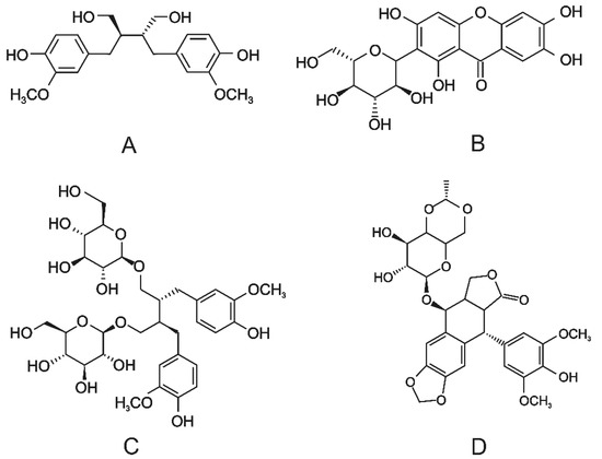 The structures of the lignans and lignan-like substrates. (A) Secoisolariciresinol; (B) mangiferin; (C) secoisolariciresinol diglucoside; (D) etoposide.