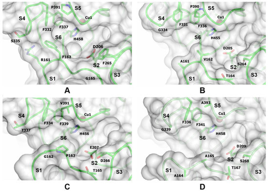 The substrate-binding pockets of ThL (A), CcL (B), AfL (C), and SmL (D). The positions of the substrate-binding loops (S1–S5), the amino acid residues delineating the substrate-binding cavity, and the Cu1 ion are indicated.