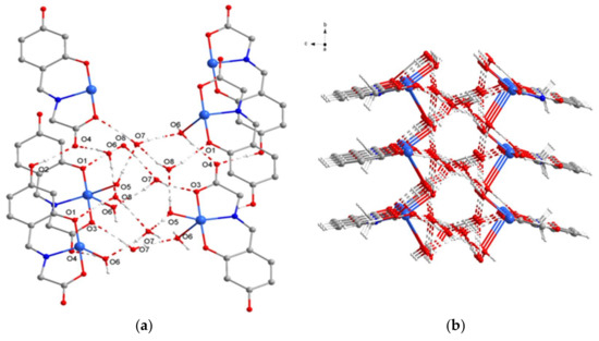 (a) The intermolecular O–H…O hydrogen bonds; (b) Representation of the 2D topologies of Complex 1. Hydrogen bonds are shown as dashed lines.