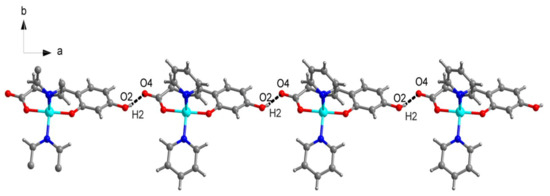 As depicted in Figure 2, the crystal structure of Complex 2 consists of one centrosymmetric copper(II) atom, which is five-coordinated in the form of a slightly distorted square pyramidal geometry (Figure 4). The corresponding bond lengths of Cu–O and Cu–N are in agreement with those of the previously reported copper complexes [16]. The supramolecular one-dimensional chain structure of Complex 2 is formed by an intermolecular interaction of an O–H...O hydrogen bond and the discrete copper (II) unit (Figure 6).