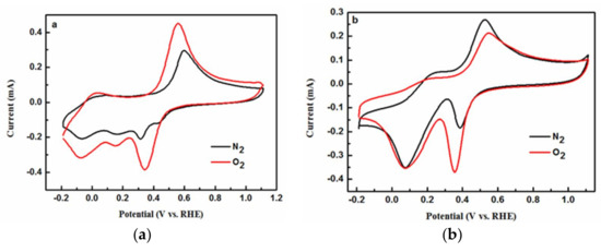 In this reduction process (Equation (6)), the Cu2+ center is reduced to Cu+, which is accompanied by the formation of Cu2+-superoxide intermediate (Equation (7)). The CV curve of Complex 1 was distinct from that of Complex 2 in that there was an intensified and broad reduction peak centered at 0.07 V for the latter. Moreover, the reduction peak was nearly unchanged from the nitrogen bubbled testing medium to the oxygen-bubbled testing medium. The origin of the reduction peak at 0.07 V under a nitrogen-saturated condition might be the negative-ionization of the pyridine ligand, which is stabilized by the positively charged Cu2+ center ion in Complex 2. The ligands of H2O molecule in Complex 1 have no aromatic properties or negative-ionization properties, which led to the absence of any apparent reduction peak at 0.07 V for Complex 1. As the CV scan was conducted towards further negative potentials from 0.36 to −0.2 V, the reduction of Cu2+-superoxide to Cu2+-peroxide (Equation (8)), and the subsequent protonation (Equation (9)) and reduction reactions (Equation (10)), might occur in the same way as that of Complex 1. The corresponding reduction peaks (as shown in Figure 11a) for these reactions might be overlaid by the negative-ionization peak of Complex 2 and do not appear in Figure 11b.