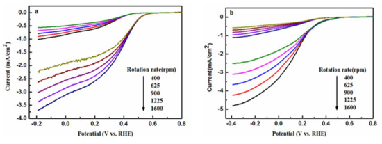 As shown in Figure 13, there is an approximate linear relationship between the above two parameters, suggesting a first-order reaction towards the rotation rate in the electrolyte [27]. The n value involved in the reduction of per oxygen molecules of Complex 1 was about 3.7 at a certain range of potentials (Figure 13a), similarly, the n values of Complex 2 were averaged to be 3.6 (Figure 13b), slightly lower than that of Complex 1. According to previous reports, the functional moieties for ORR activity in metal complexes is M–Nx, and the value for x might play a role in determining the capabilities of the catalysts [4]. It was interesting in the present study that the number of the nitrogen atoms chelated with copper ion was not a determining factor influencing the ORR activities of the complex since the ORR performance of Complex 2 was somewhat inferior to that of Complex 1 in terms of n values, although Complex 2 has more nitrogen numbers than that of the latter one. Compared with pyridine molecule, the H2O molecule has a smaller bulk volume, and the copper atom in Complex 2 has a smaller steric hindrance effect than the copper atom in Complex 2. A small steric effect is conducive to the binding of oxygen to the complexes in the ORR process, as well as the formation of the intermediated products (as shown in Equations (1)–(10)), which might account for the slightly higher n values of Complex 1 compared with that of Complex 2.