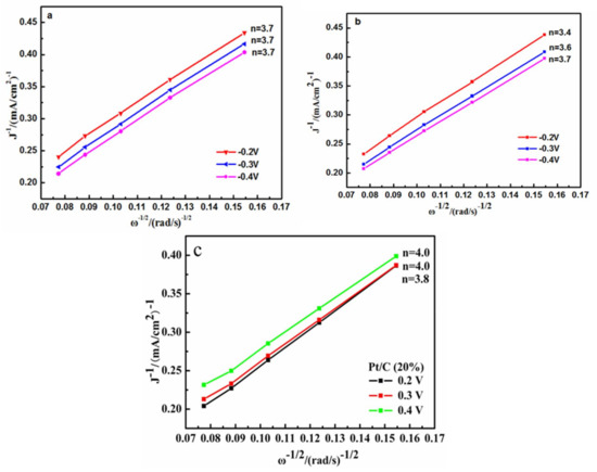 To obtain the electron transfer numbers (n) involved in the reduction of oxygen, the Koutecky–Levich (K-L) equation was utilized to plot the relationship between j−1 and ω−1. The K-L equation can be expressed as follows: