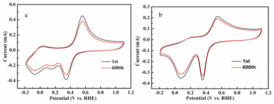 Continuous CV sans were undertaken for up to 600 cycles for the evaluation of the stability of the complexes in the ORR process. The reduction in the peak currents were recorded at the 600th scan, and the losses were 15.71% (at 0.34 V vs. RHE) and 9.76% (at 0.36 V vs. RHE) compared with the 1st scans, which showed that the cycle stability of Complex 2/C was slightly better than that of Complex 1/C (Figure 14). The aromatic properties of pyridine as the ligand was helpful to stabilize the charged intermediates formed during the redox process of the complexes, which could account for the higher stability of Complex 2/C than that of Complex 1/C. In general, both of the complexes had moderate redox stabilities, as considering the performances of other complexes reported previously [29,30,31,32].